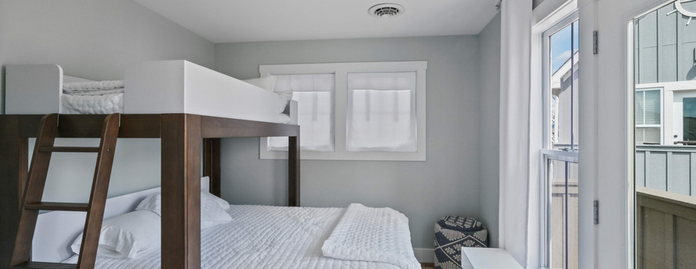 Primary Bedroom: King-size bed, walk-in closet, and marina views from the front balcony. Second Bedroom: Twin-over-queen bunk bed—great for kids or a cozy night in. Full Bathroom: Tub/shower combo shared between the bedrooms.